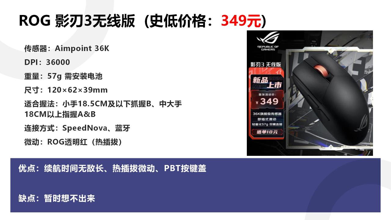 首先是ROG的影刃3无线版,这是ROG前段时间发布的新品,主打一个便携+长续航的属性。2.4G模式下足足有450小时的续航,比G304还要再长一倍,而且传感器是华硕定制的3395.我感觉这东西半年都不需要换一次电池,喜欢G304的完全可以把它作为一个上位替代。