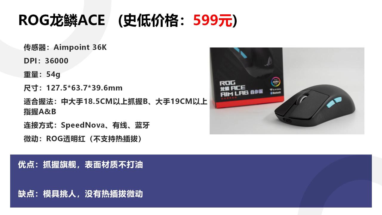 500元以上价位的产品,ROG的龙鳞ACE、蝰蛇V3Pro、还有一款毒蝰V2Pro这三款你就闭着眼睛买就行,这三款我并不想讲太多。