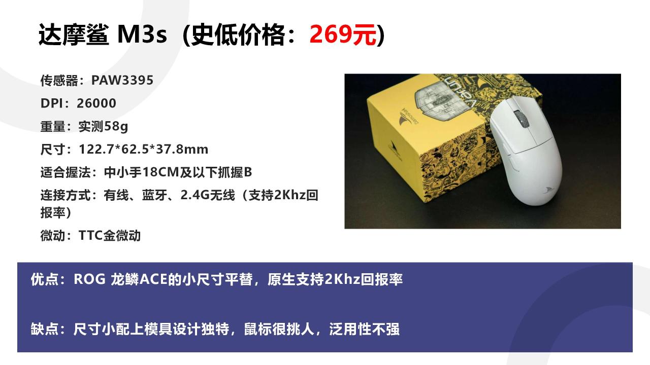 达摩鲨M3s可以看成ROG龙鳞ACE的缩小版,两款鼠标的模具设计很像。而且M3s有原生支持且不需要另购的2Khz回报率,可以说目前最便宜的2Khz回报率鼠标之一。
