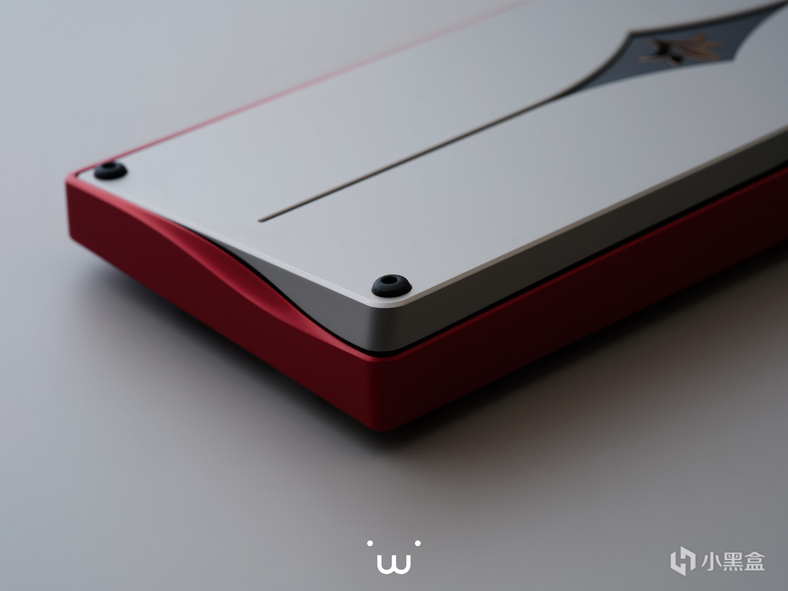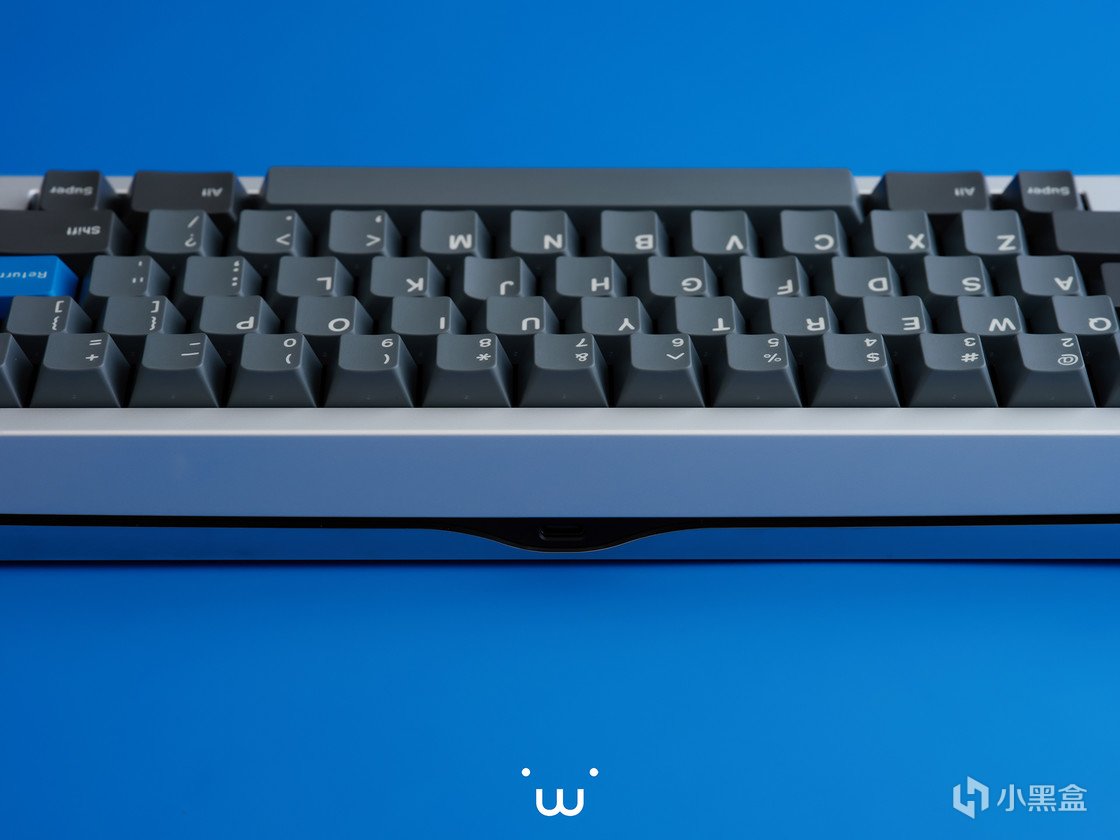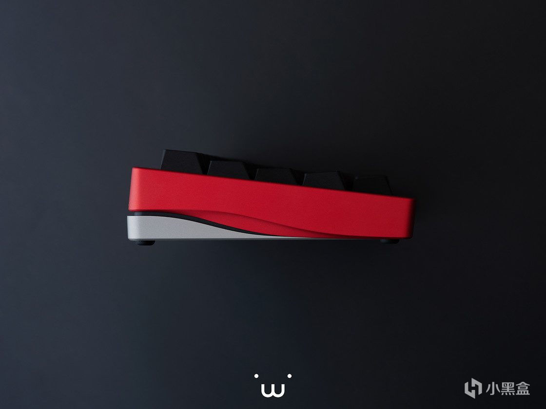 正面来看,左右两侧细窄的边框但并不极端,上下宽度差并不大,为键盘的整体造型定下了精致而紧凑的基调。位于右下角的状态指示灯条,除开大小写指示灯和层数切换的功能性,也是设计上的点睛之笔,打破了正面的单调,为玩家的视觉焦点提供了一个明确的指引。