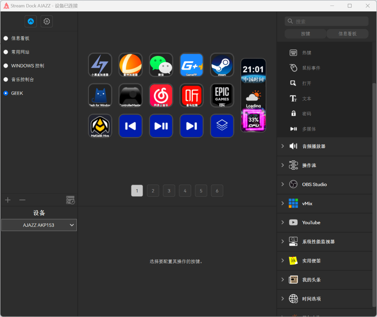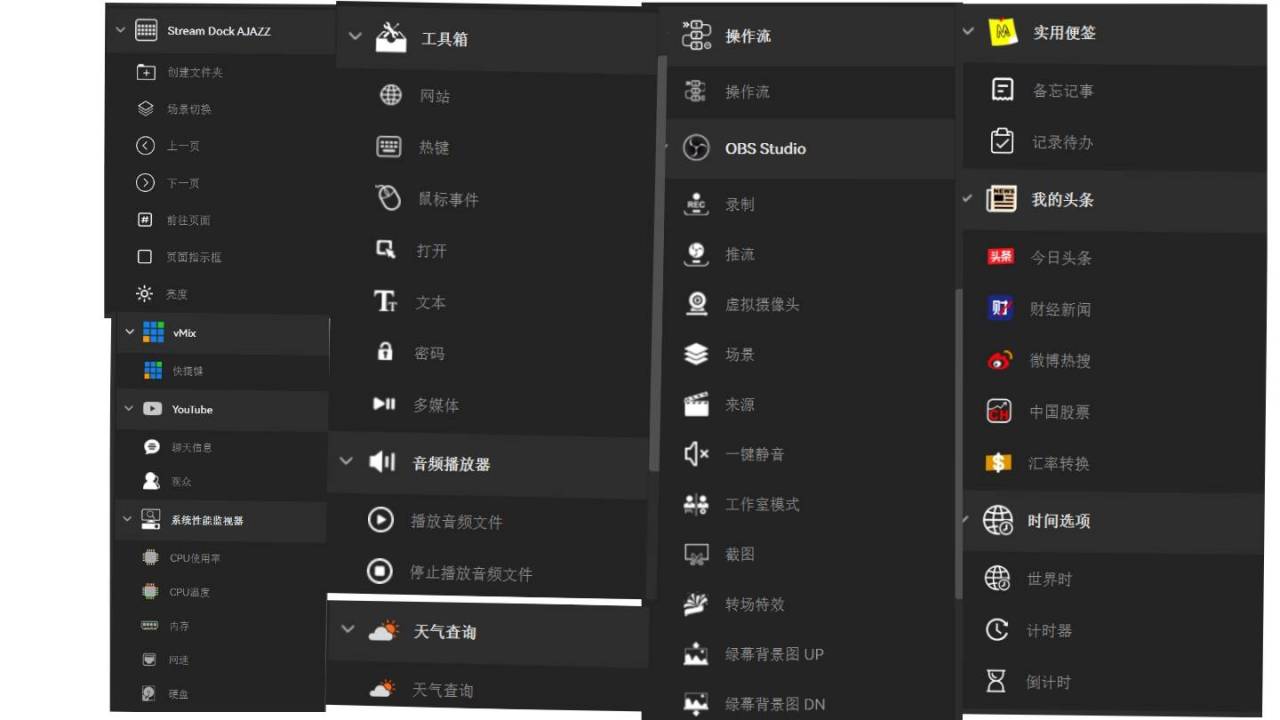 除了单个常规面板,你还可以设置一些其他的功能性面板,比如在玩游戏的时候,做一些obs录屏开启,截图。
