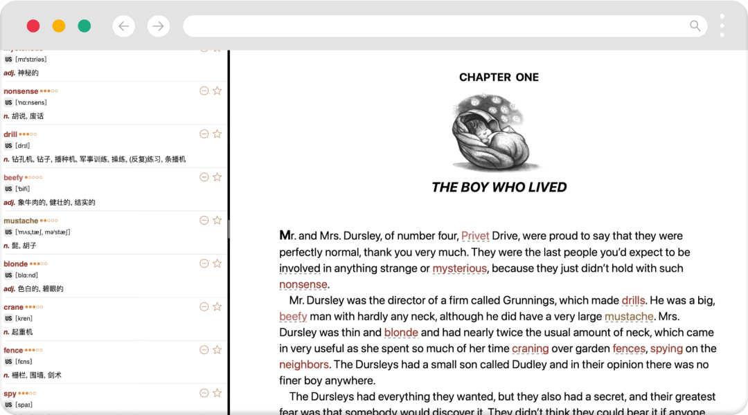 爲外語學習者設計的有聲讀物閱讀器,支持多種格式的電子書。當閱讀一本英語書的時候,遇到生詞可以直接查詢多部字典,並且有完善的分級/分類詞頻標記。
