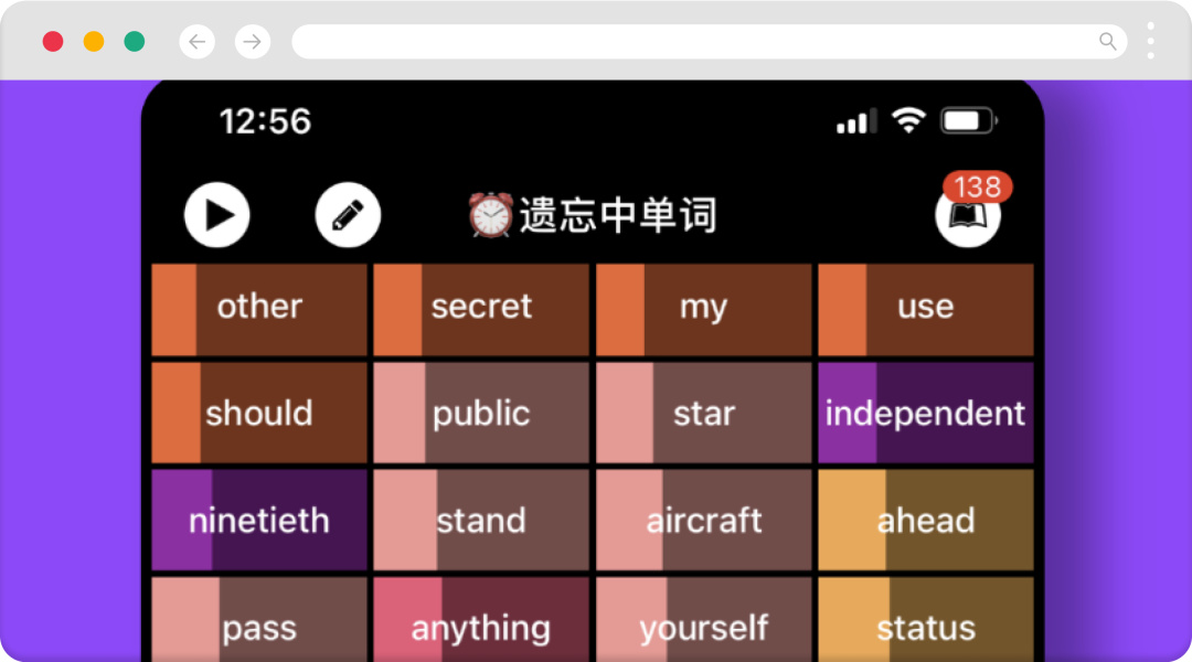 通過單詞塊裏的顏色組塊能夠一覽單詞的掌握程度(剛開始學、已經掌握、開始忘記),同時也有選擇題模式、播放模式、拼寫模式根據自己習慣去複習,對於不喜歡主流背單詞複習模式的朋友來說值得一試。