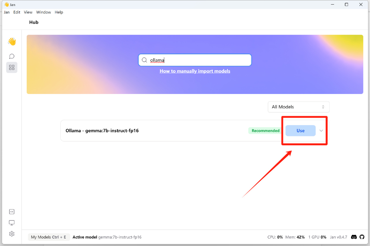 重新启动 Jan ,在模型HUB中找到我们刚才新建的gemma:7b-instruct-fp16,然后点击“USE”即可。