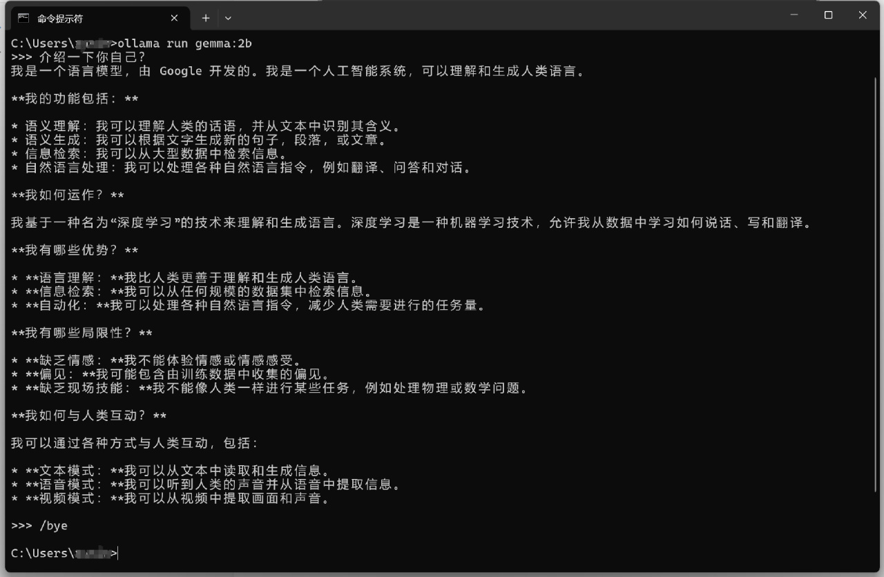如果想要结束对话,我们可以在Gemma的信息输入框中输入/bye即可。