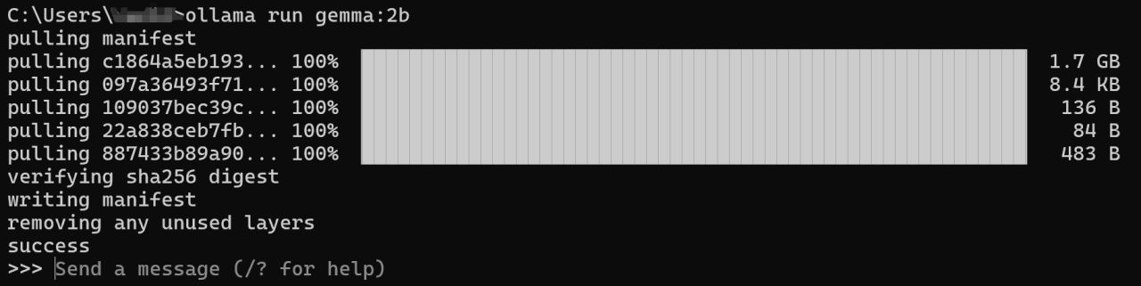 以对电脑配置要求最低的Gemma 2b基础版模型为例,在命令提示符中,我们输入ollama run gemma:2b代码并回车,Ollama会自动从模型库中拉取模型文件并进行运行。当模型加载后,会显示success的标识,此时我们就可以输入汉字与Gemma:2b进行对话了。