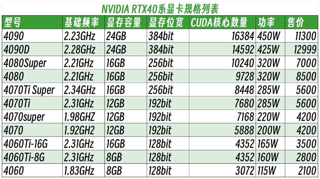 对于大部分玩家而言,退而求其次的选择则是4080Super、4080、4070TiSuper、4060Ti-16G这几张16GB显存的显卡。毕竟算力高低无非是影响AIGC干活儿效率而已,但是显存不够大,那有些本地大模型是真的跑不起来,连门槛都进不了,确实会耽误事儿。