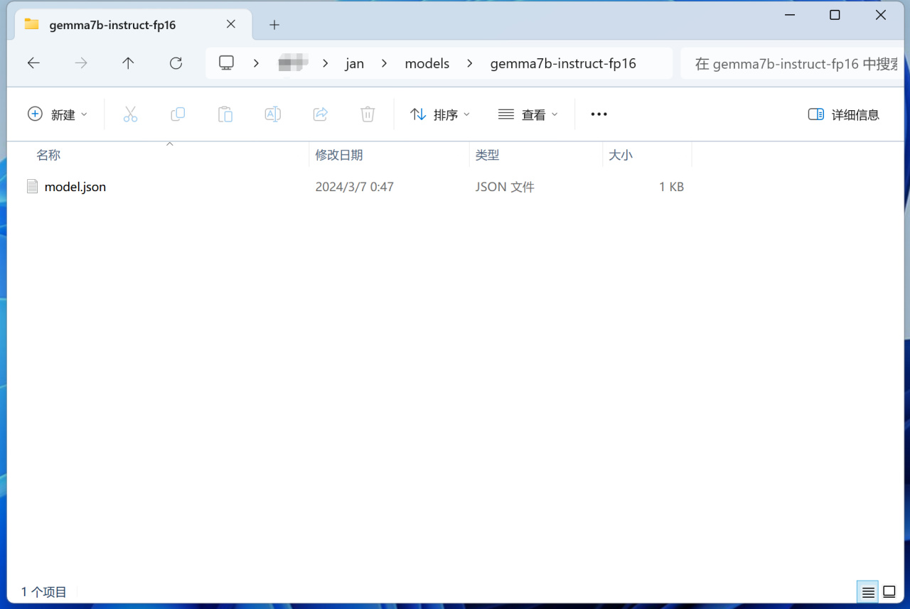 进入jan安装位置的models 文件夹,创建一个在Ollama中运行的模型同名的文件夹,例如gemma:7b-instruct-fp16。