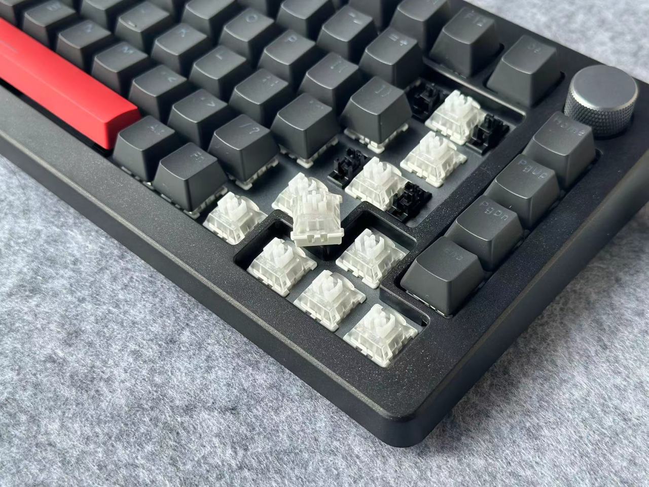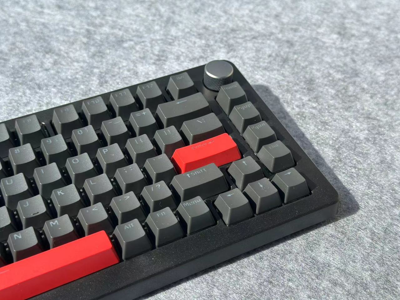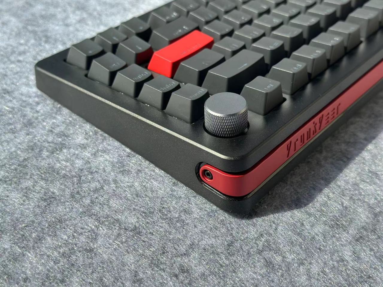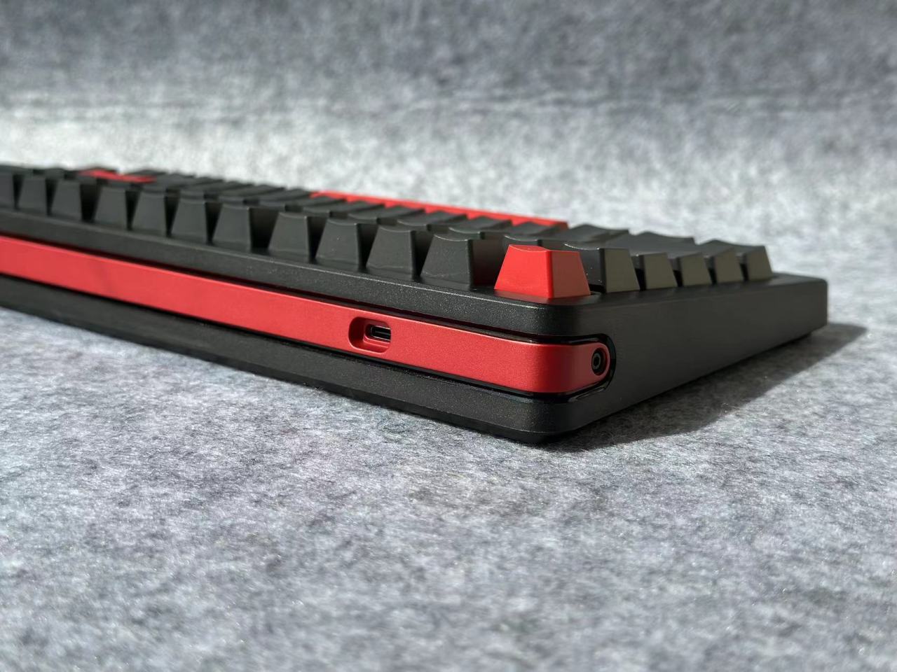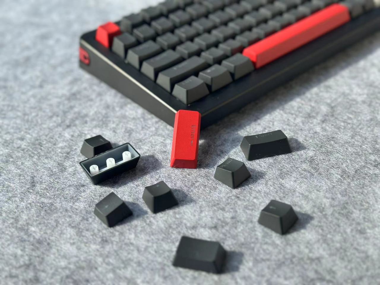 A75Pro这次的键帽采用PBT材质原厂高度,整个键帽的配色也是比较朴素单纯的黑色,加上红色做为点缀。然后这次的键帽在用料上明显是比之前A75的PBT含量高了,且整个表面是明显感觉到了颗粒感。