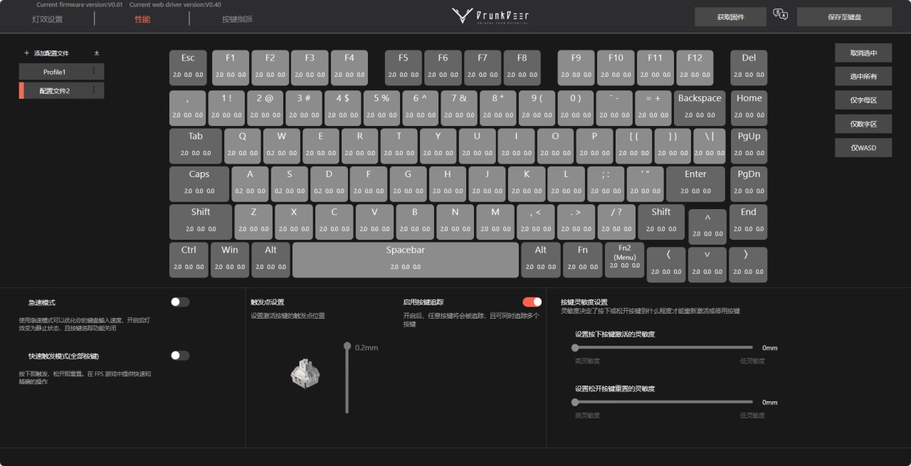 A75之前的软件版本现在A75PRO改成网页版本了。我个人是觉得网页版本是比软件舒服的。能够完美解决软件后台占用的问题,在切换电脑时下驱动的麻烦。长话短说,大家可以通过驱动来自定义按键的触发行程,最低为0.2mm,相当于是碰一下键帽基本上就触发了。而设置回弹行程,最低0.2mm,什么意思呢?相比传统机械轴你按下去,然后要等整个轴体回到原位才算一次。而磁轴是当你设置到0.2mm时,你按下不需要等待轴体完全回弹才算一次,而是在回弹到原位的过程中的0.2mm就可以算一次回弹了。