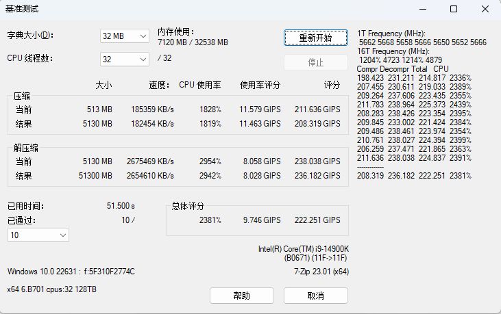 CPU壓縮與解壓縮數據的性能對電腦的內存性能十分敏感,遊戲的讀取與很多生產力軟件的文件輸出任務,實際上都是CPU在執行壓縮與解壓縮任務。我們使用7Zip的基準測試來看一看i9-14900K在兩組頻率與時序下的性能區別。