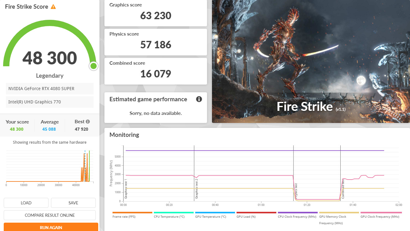 ▲在內存頻率6800MHz時,本電腦的3DMark Fire Strike得分爲48300分,其中顯卡得分63230分,物理得57186分,綜合得分16079分。