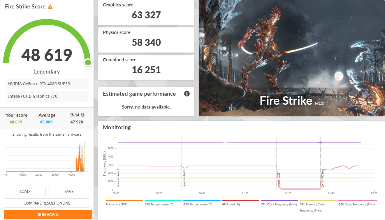 ▲在內存頻率7800MHz時,本電腦的3DMark Fire Strike得分爲48619分,其中顯卡得分63327分,物理得58340分,綜合得分16251分,其中物理得分相較於6800MHz時提升最明顯。