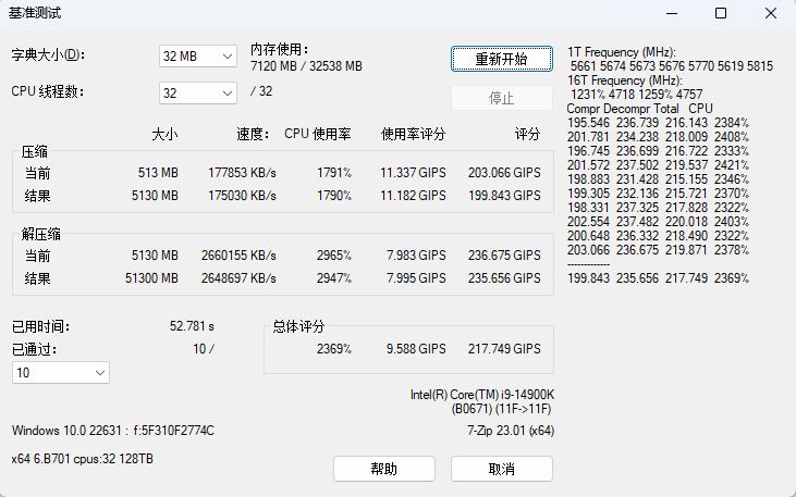 ▲6800MHz時,i9-14900K的壓縮評分爲200 GIPS,解壓縮評分爲236 GIPS,總體評分218 GIPS。