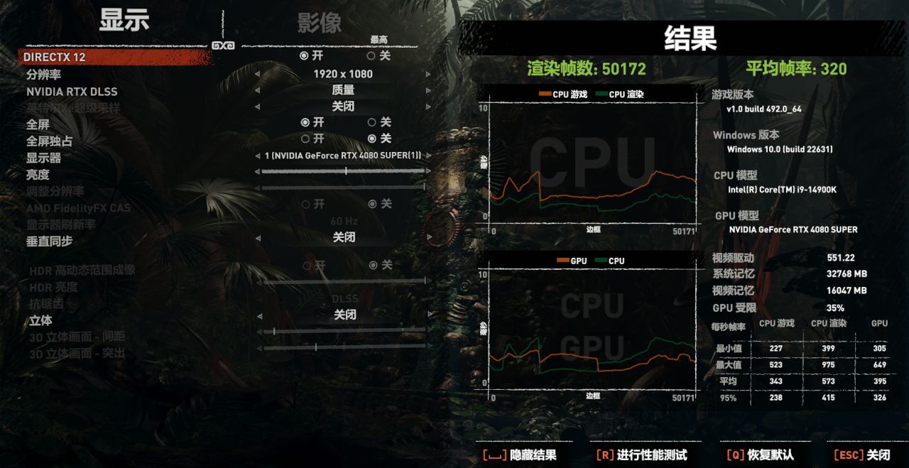 ▲同設置下,內存7800MHz下,本電腦的平均幀率提升到了320 FPS,此時GPU受限僅也上升到了35%。