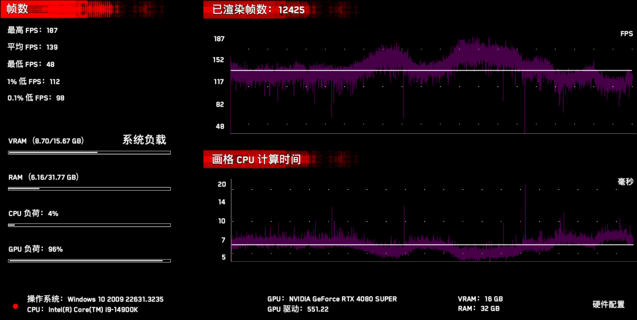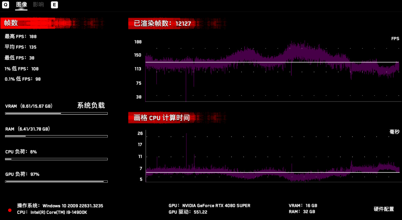 除了內存提升1000MHz,遊戲幀率提升了8PFS之外,我們還可以看到RTX 4080 SUPER顯卡的性能之強,14900K+7800MHz的內存也只能提供35%的GPU受限,因此我們有理由相信,繼續提高內存頻率,遊戲幀率還有再進一步的空間。