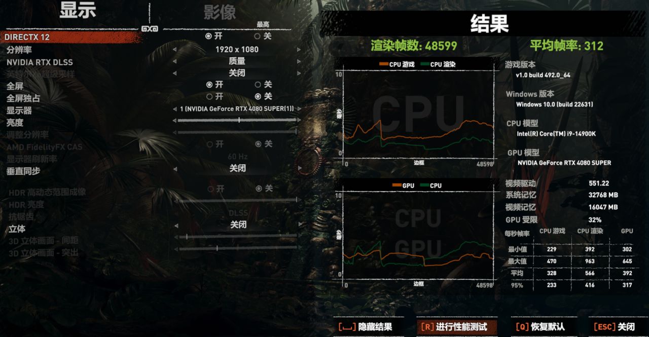 ▲在1080P分辨率,預設最高畫質,DLSS質量模式下,內存6800MHz下,本電腦可以提供312FPS的平均幀率,此時GPU受限僅爲32%。