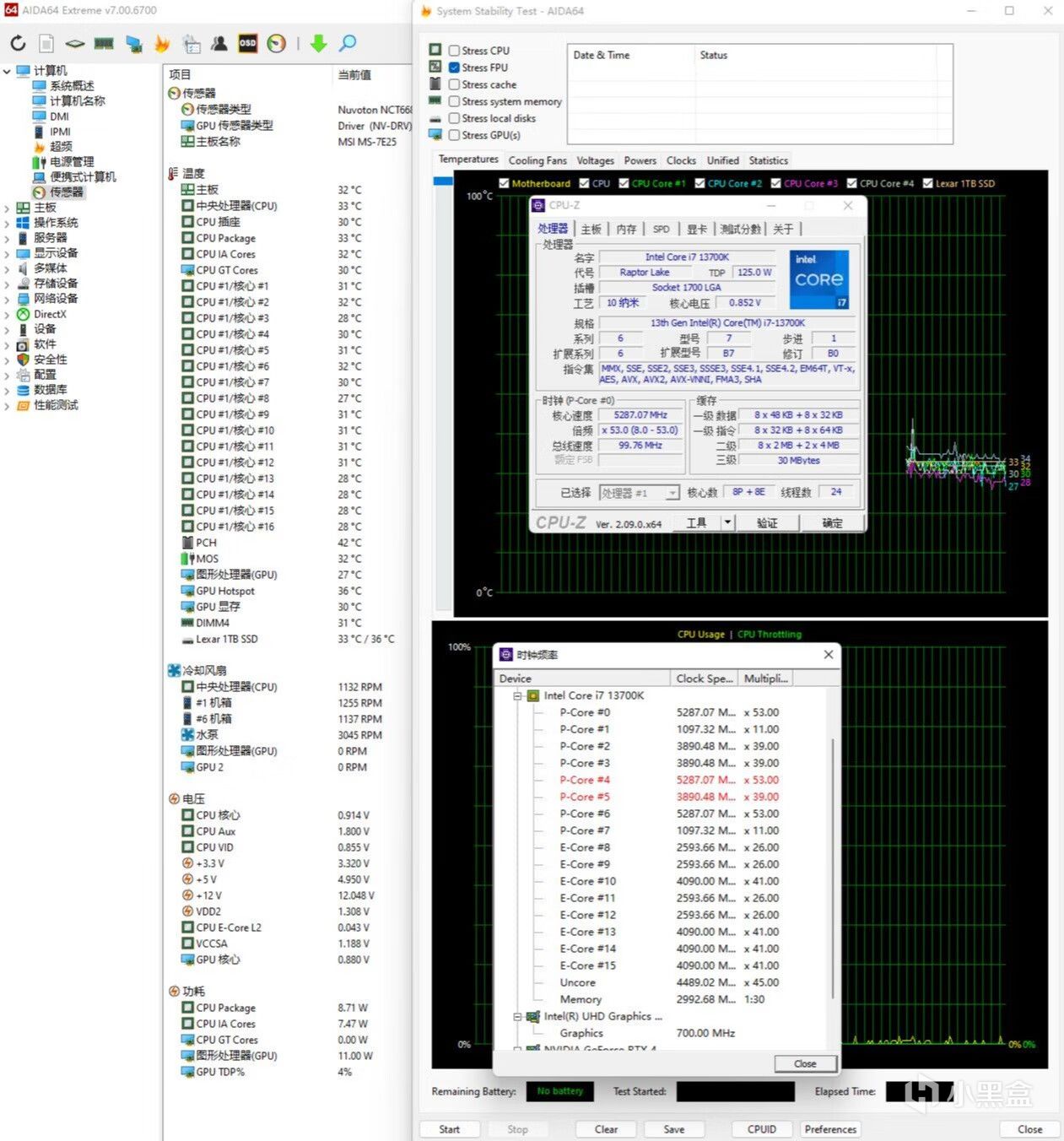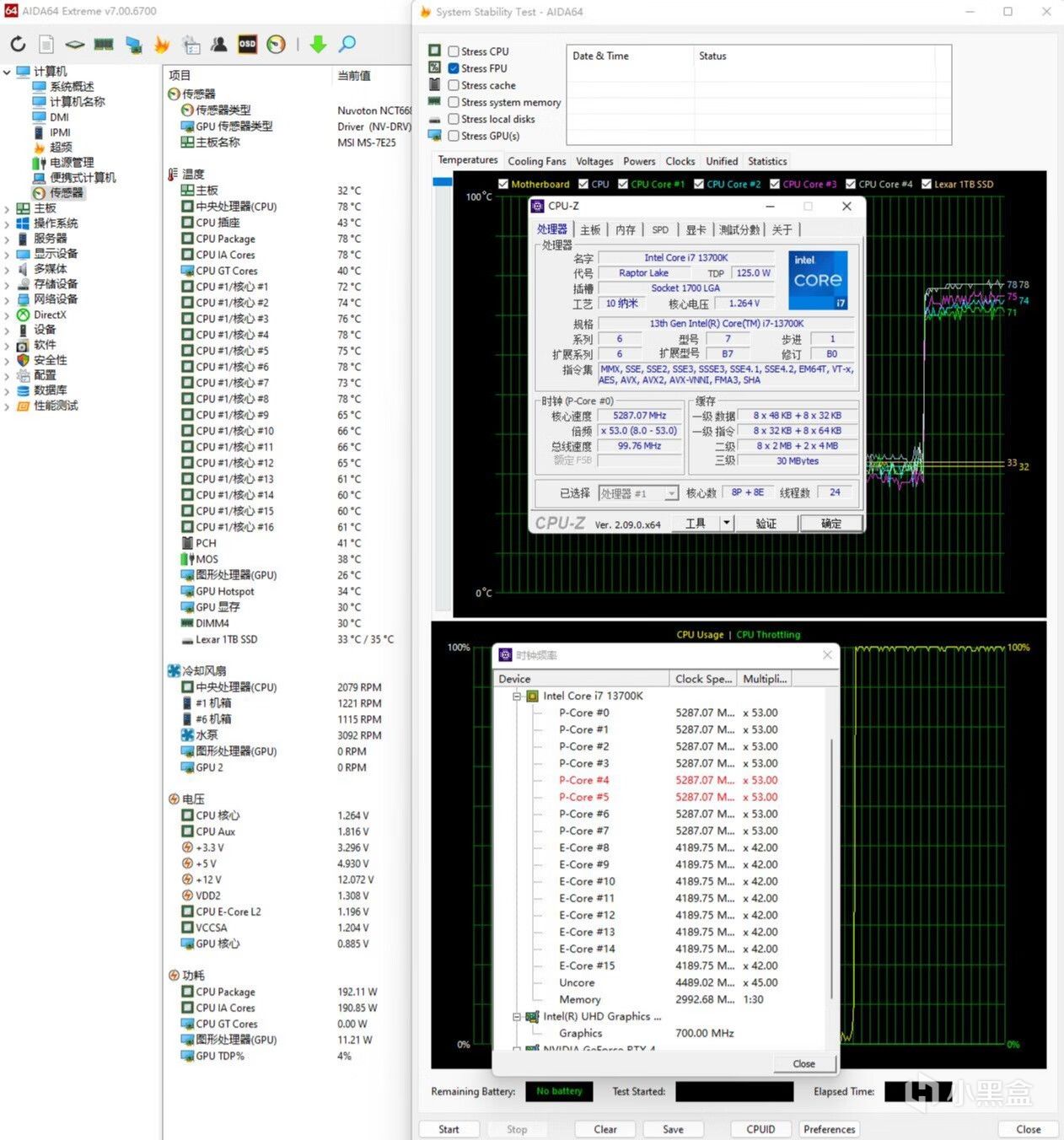 ▼简单跑个CPU-Z的压力测试,处理器功耗在200W左右,大核心睿频5.3GHz,小核心睿频4.2GHz,温度在78℃左右,南桥41℃,供电38℃,显卡核心26℃,固态33、35℃。