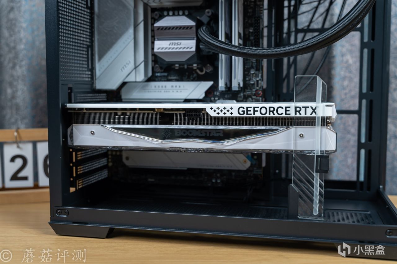 ▼显卡厚度两槽半多点,水平安装,并在显卡的尾部撑一个显卡支架。
