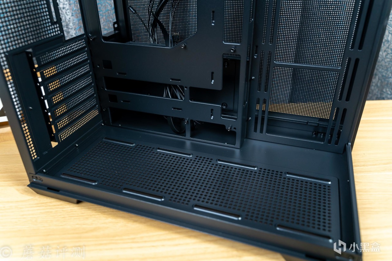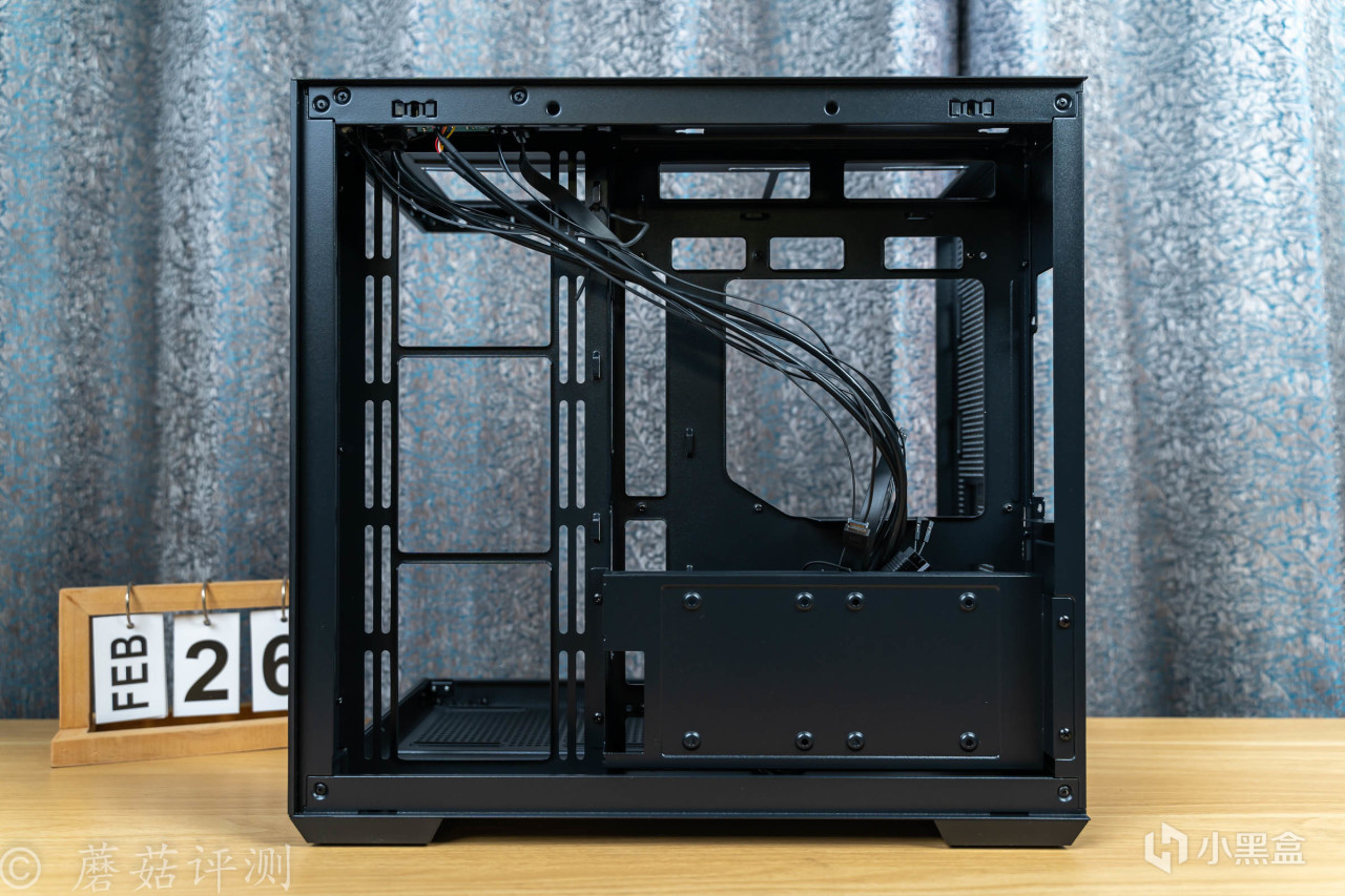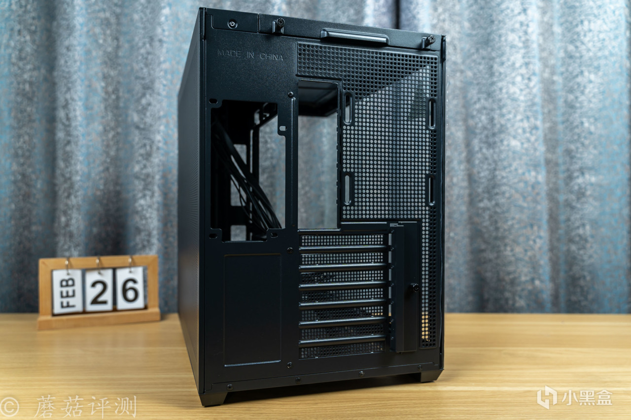 机箱的内部结构方面,是经典的双仓设计,电源仓放在主板的背面,机箱正面可以完全看不到电源仓,整机的效果会更加漂亮。且电源放在背面,走线空间超级充足,机箱背面的金属盖板一整面都是金属冲孔,散热效果很不错。