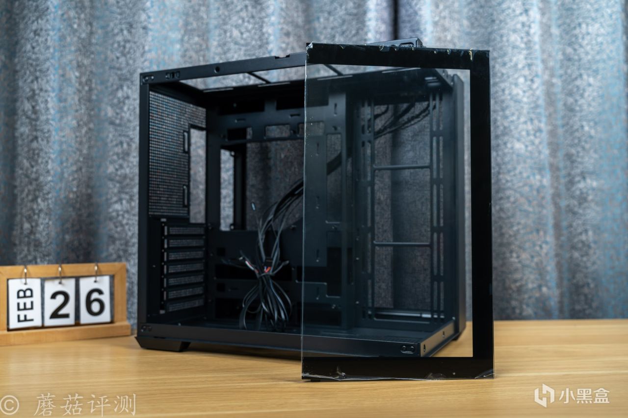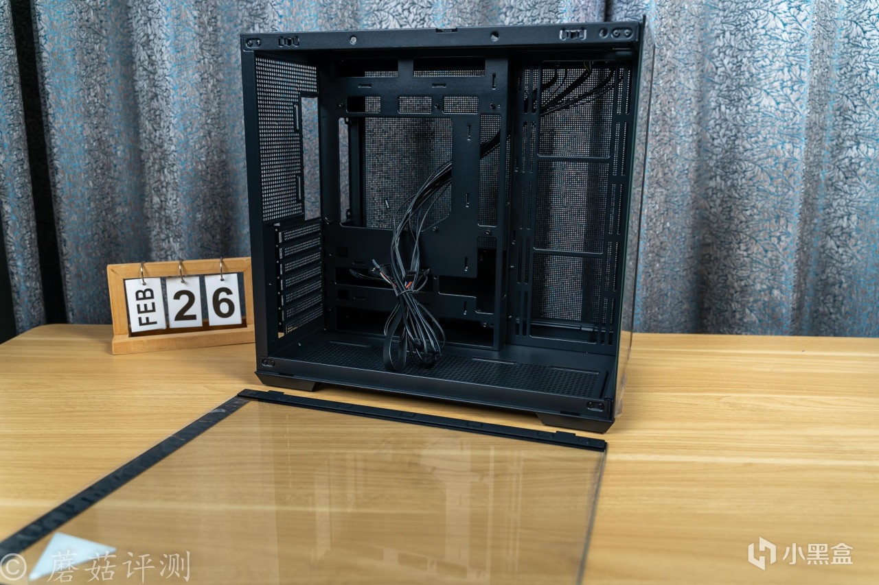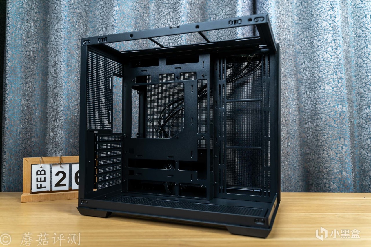 机箱的内部结构方面,是经典的双仓设计,电源仓放在主板的背面,机箱正面可以完全看不到电源仓,整机的效果会更加漂亮。且电源放在背面,走线空间超级充足,机箱背面的金属盖板一整面都是金属冲孔,散热效果很不错。