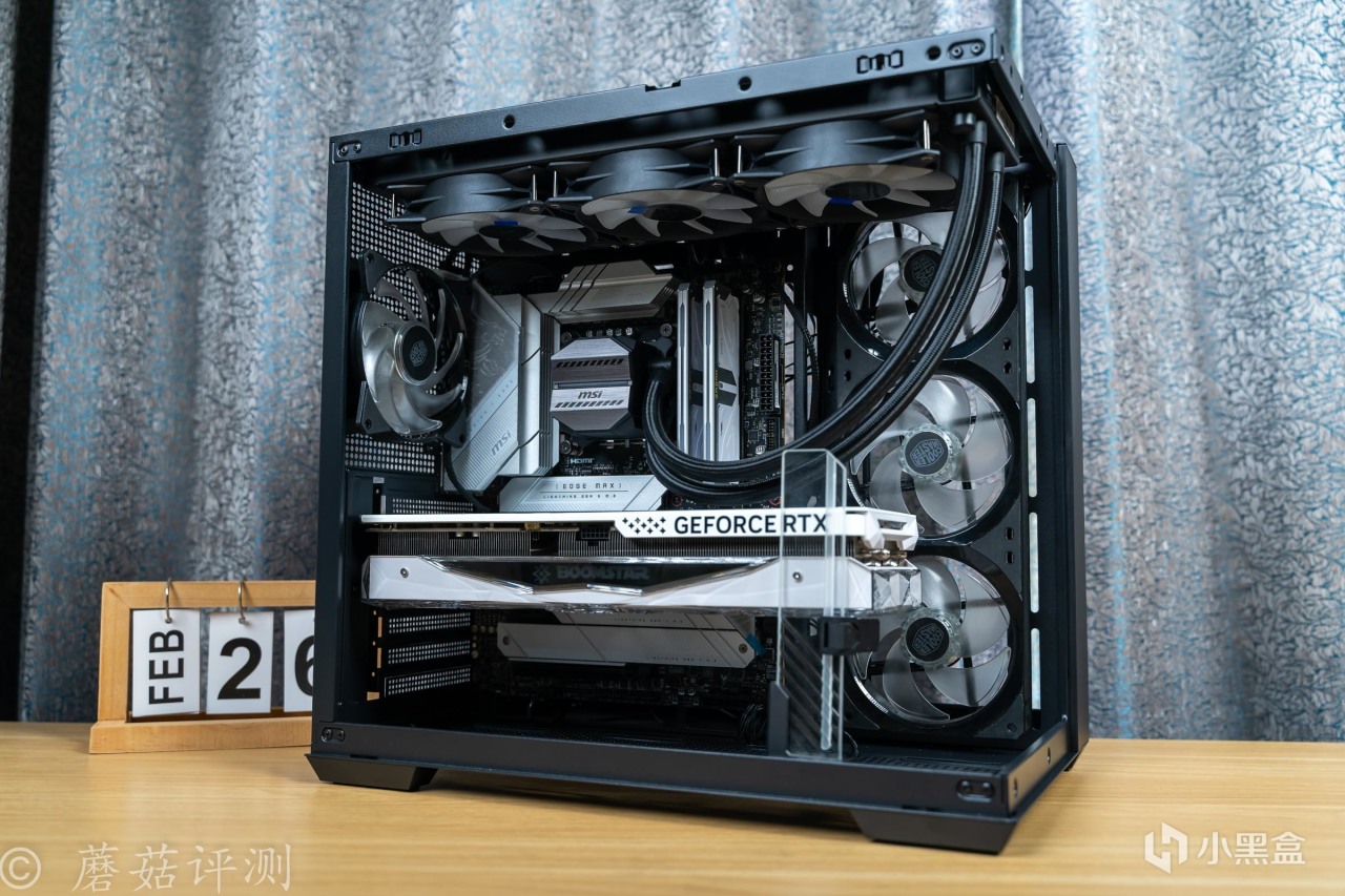 ▼机箱内部的空间非常大,主板固定在左侧,最大支持ATX规格,支持背插主板,顶部和侧面,可以安装固定水冷排和风扇。