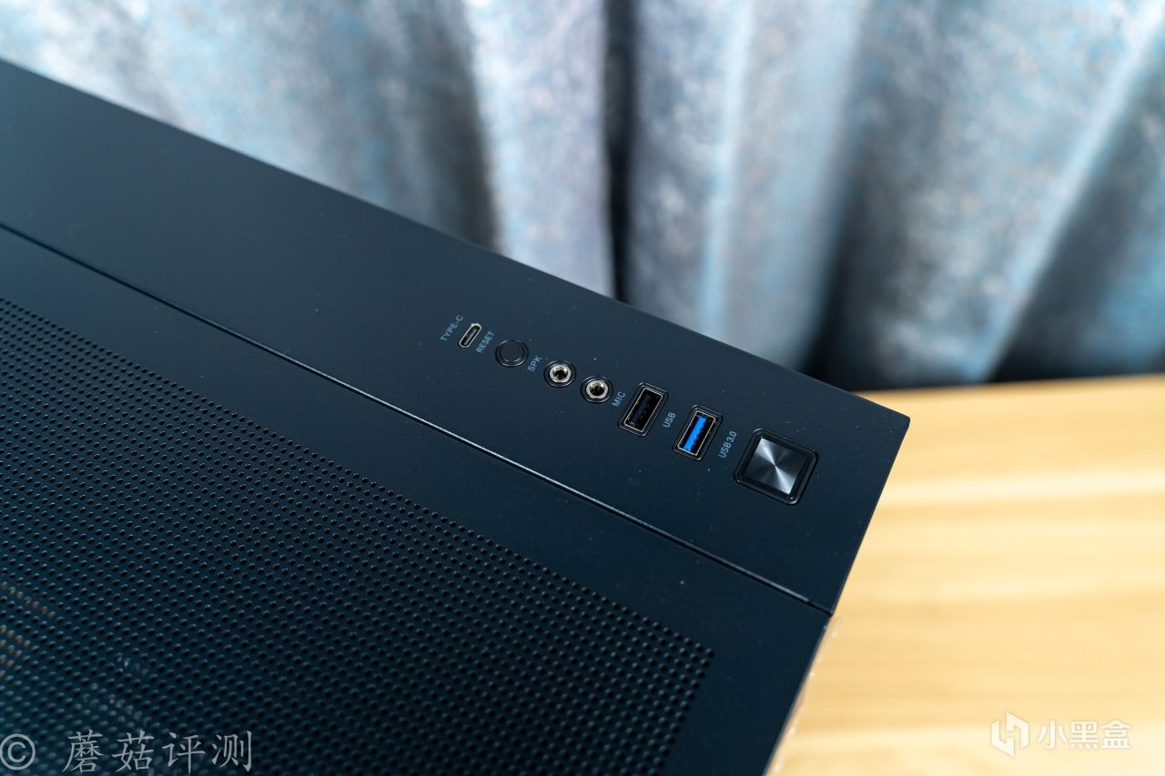 ▼机箱的IO面板,接口非常齐全,USB 3.0 Type-A接口一个、USB 2.0接口一个、音频接口两个、Type-C接口一个、还有开机和重启键。