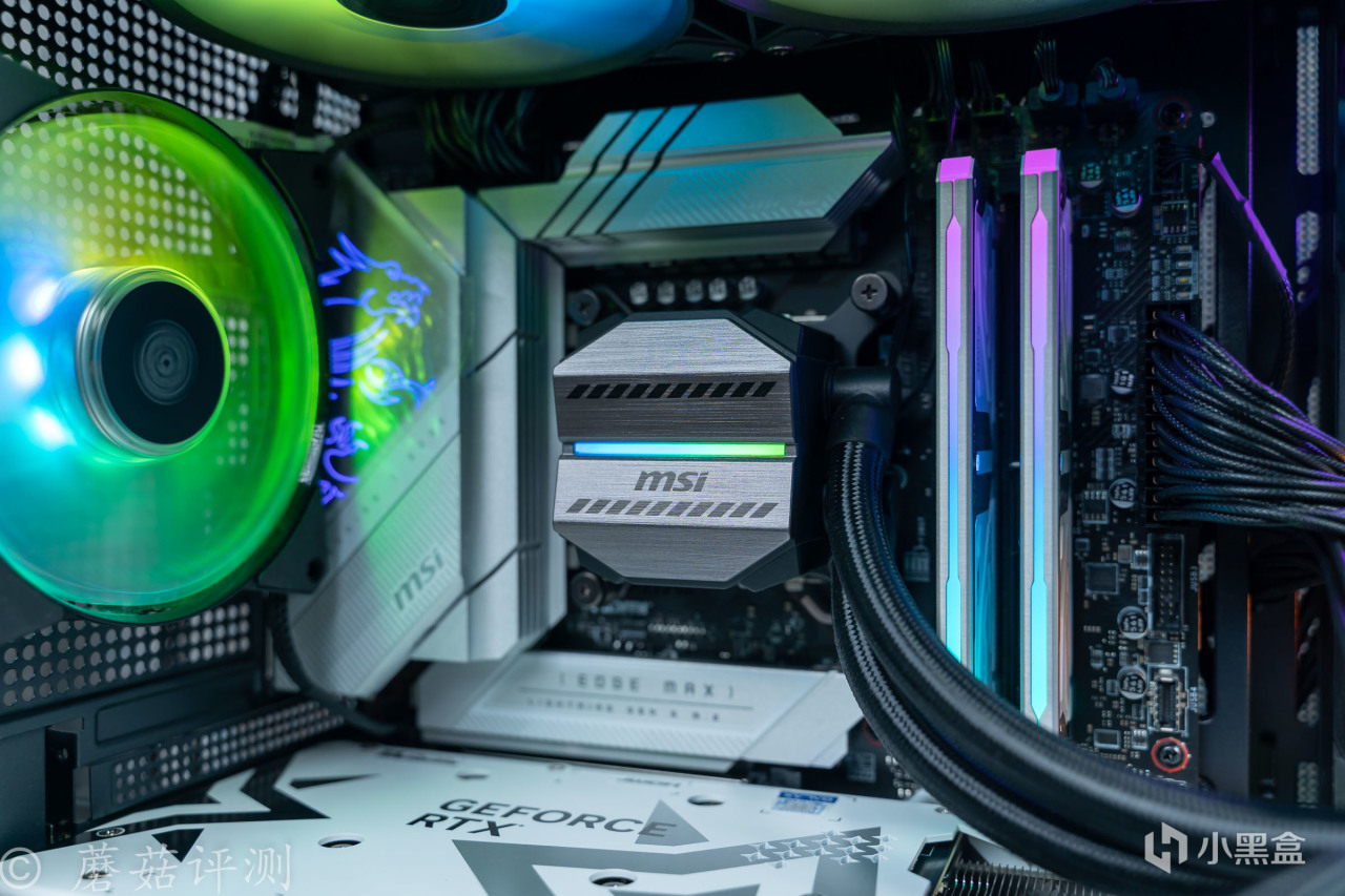 ▼水冷用的是微星的迫击炮M360一体式水冷,这款水冷的水冷头涂装是微星迫击炮系列的一贯风格,表面有细腻的拉丝处理。并在水冷头的中间,点缀了一条RGB灯带,支持ARGB灯效。