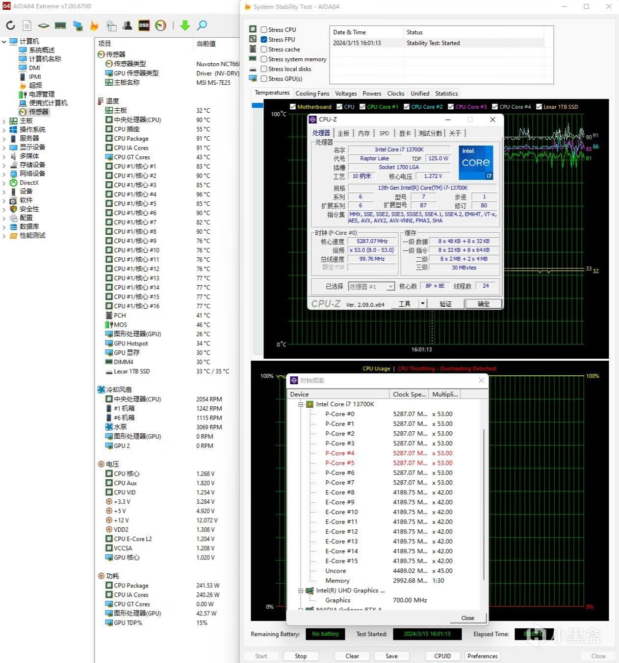 ▼单烤FPU测试,处理器功耗在245W左右,大核心睿频5.3GHz,小核心睿频4.2GHz,温度90℃,南桥41℃,供电46℃,显卡核心26℃,固态33、35℃,散热表现不错。