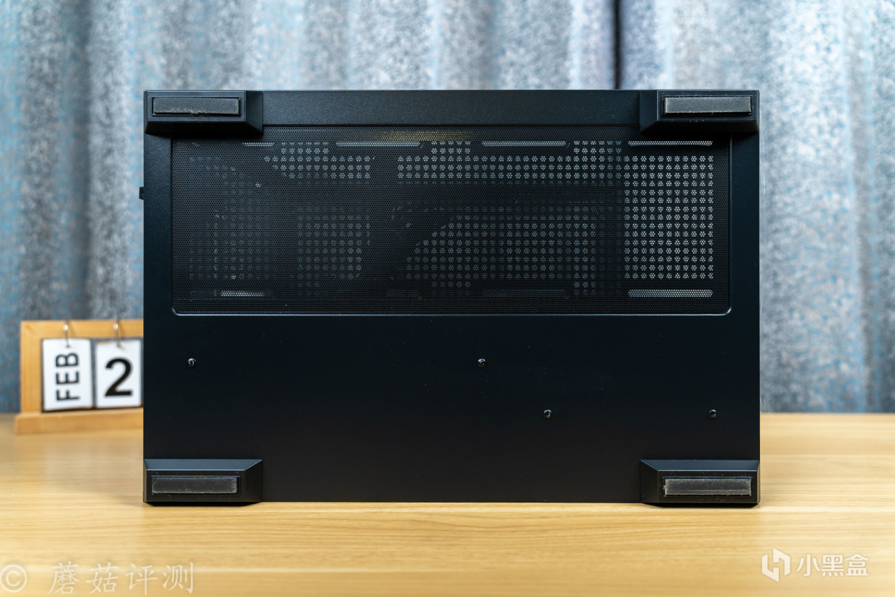 ▼机箱底部,四角有四个防滑脚垫,上部是磁吸式的金属冲孔网,用于前仓散热。