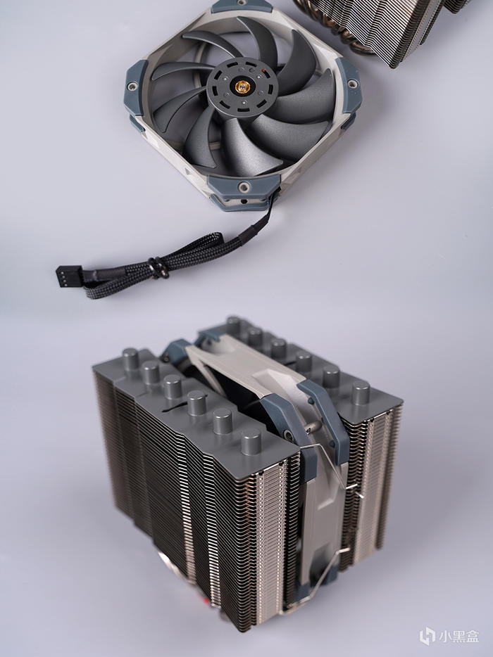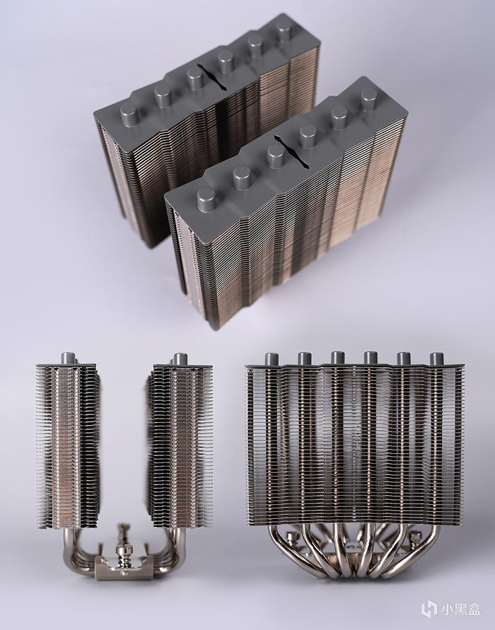 散热器本体,专为 ITX 平台,采用小尺寸的迷你双塔设计,尺寸 120×94×135mm,顶部配备有灰色金属面板(另有黑色和白色版本),热管戴帽处理,少了些工业风,多了一丝简约的味道,鳍片数量 46PCS×2,规格 0.4mm 的厚度,间隙 1.6mm,折边全扣fin,鳍片之间紧致工整.