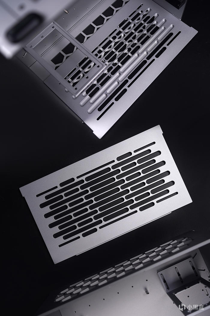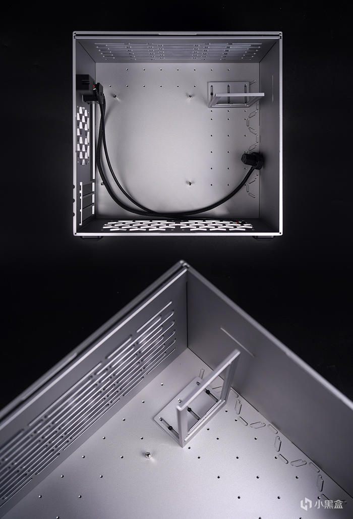 机箱内部很简单,可见一个可调节高度电源支架,支持安装 SFX/SFX-L 规格的小电源,同为铝合金材质,另可见还有密密麻麻的孔洞,这是用于安装附带的理线架,并不支持走背线,侧板即主板的安装位。