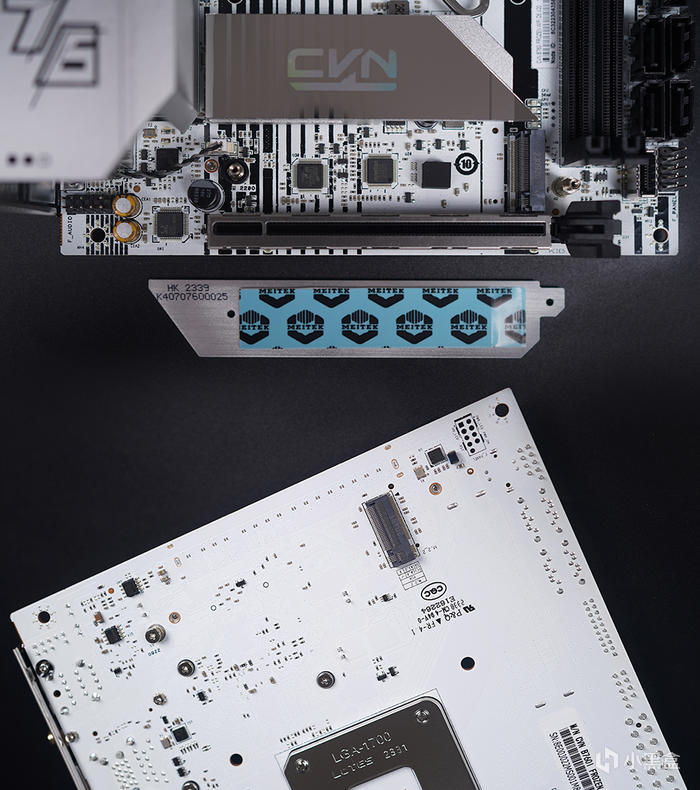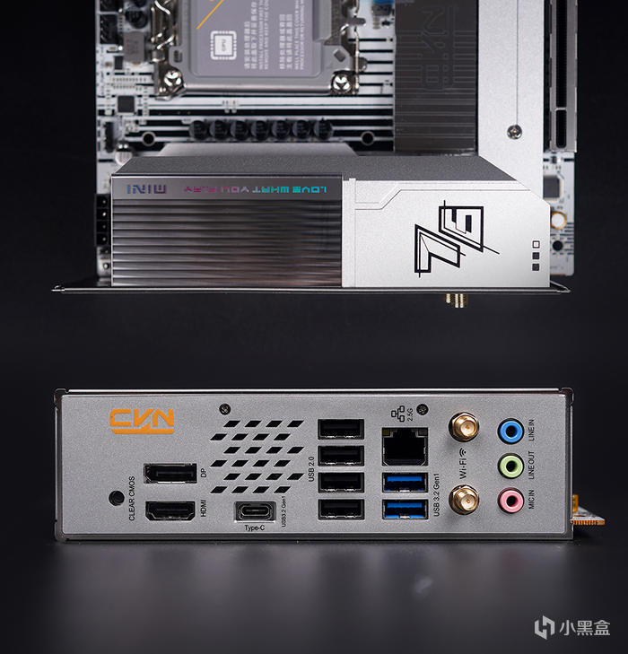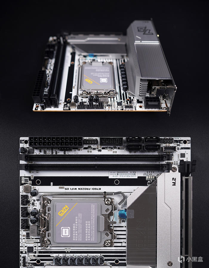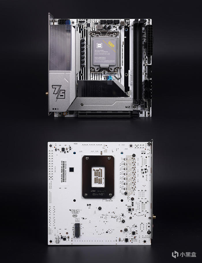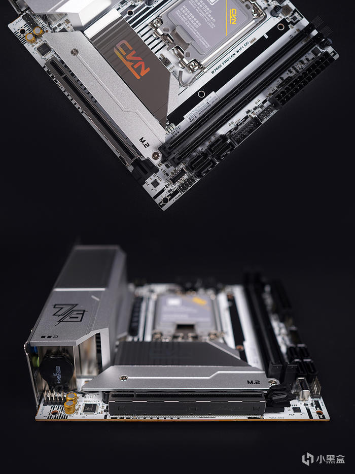 七彩虹 CVN B760I FROZEN WIFI D5,主打白色设计,当下 ITX 主板中唯一采用白色 PCB 的选择,散热装甲为银色阳极处理,在供电和南桥散热装甲上装饰有斜纹毛玻璃效果装饰片,质感十足。