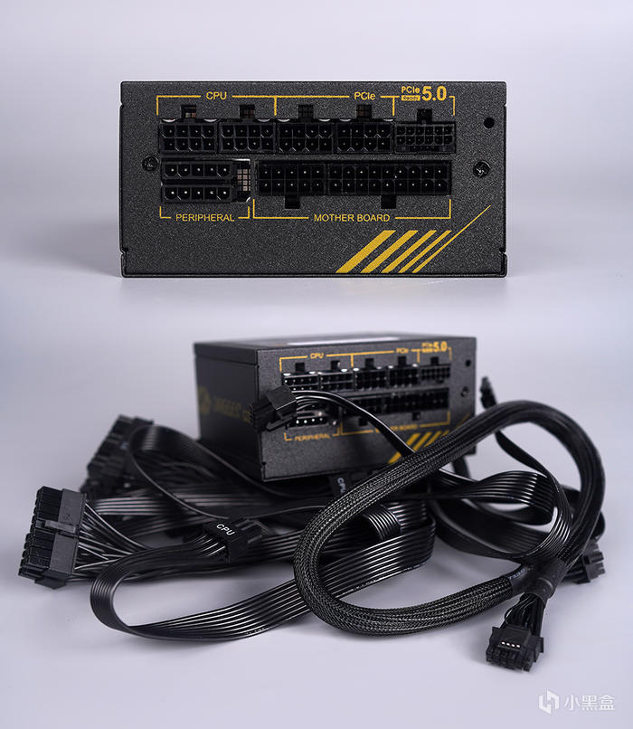 模组方面均配文字的区域示意,配备了 1× PCle 5.0 12VHPWR 接口( 额定功率最高可达 600w )、2× PCIe 接口、2× CPU 接口、2× PERIPHERAL 接口、2× MOTHER BOARD 接口。