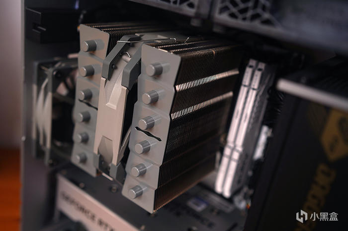 搭配风冷小塔,选用的利民 SS135 银魂,这款散热器完美契合机箱支持的最高高度 135mm,外观配色匹配方案使用,采用灰色金属顶盖,使得散热少了些工业风,多了一些简约的感觉,官标 TPC 可达 220W,也完全能够满足需求。