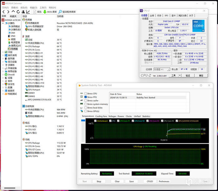 P-CORE 温度最大值 64°C,E-CORE 温度最大值 52°C,CPU Package 功耗 113W 左右。