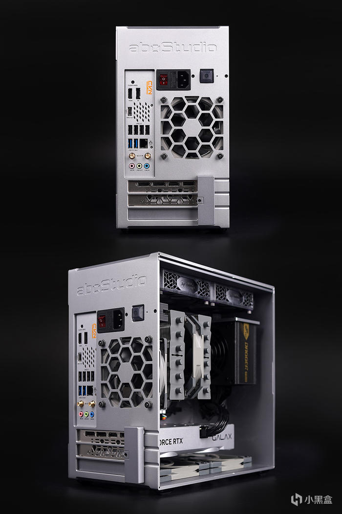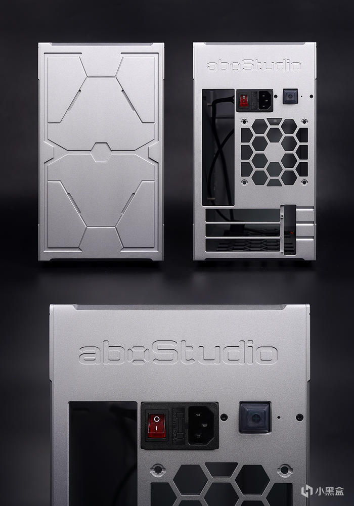 aboStudio Container M 机箱采用一体式框架设计,方正造型,前后上下左右边角做了些切割倒角处理,正脸阴刻机甲图案,样式颇为钢铁侠,整体呈现出硬朗而精致的视觉效果。机箱尾部,阴刻了 aboStudio logo 示意点缀。下面的电源接口,带开关设计、一个机械开关设计的开机按键、一个 90mm 风扇安装位、三个 PCI 卡槽。
