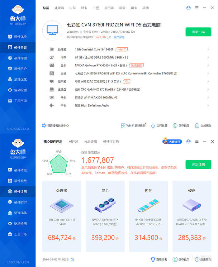 鲁大师,具体的配置信息,给到的综合性能得分为 1677807。