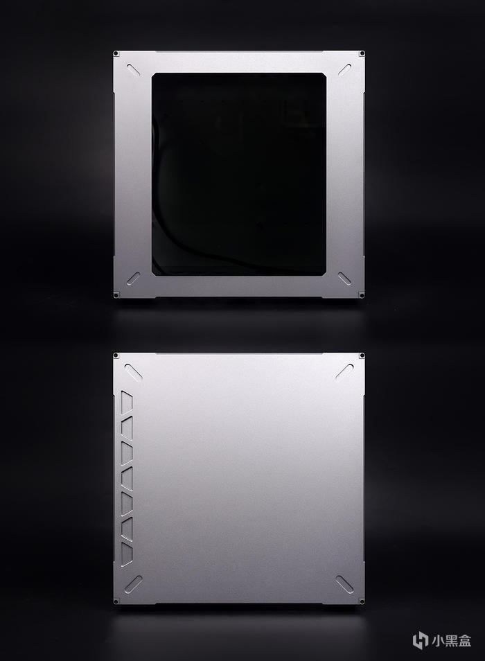机箱侧面为标准的正方形设计,具体尺寸 300×300×170mm,约为 15L 左右,左侧标配熏黑钢化玻璃侧透,右侧边上设计了一排隐藏式进风开孔,两侧板均采用常规螺丝固定,拆卸会相比比较麻烦一些。