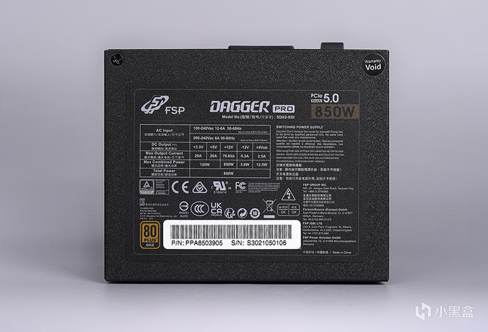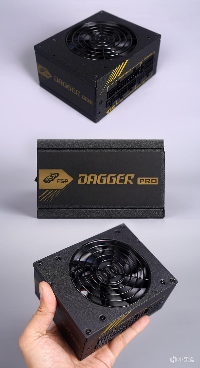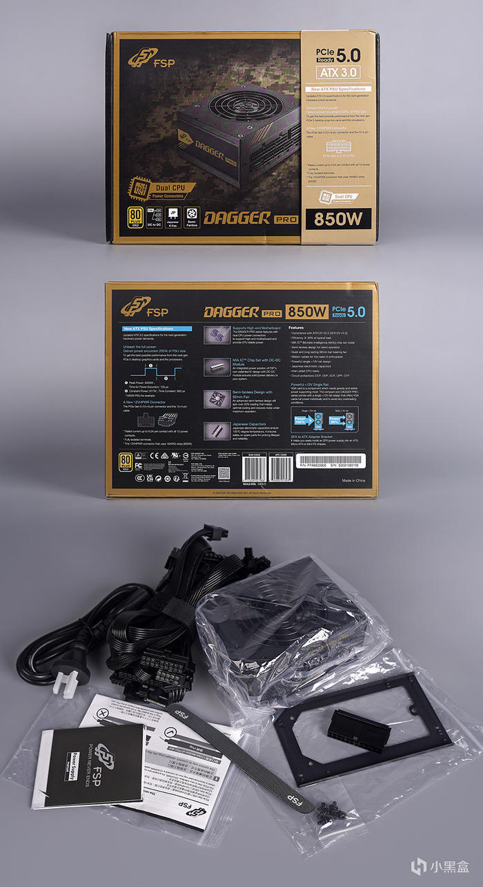 选用电源,全汉 FSP Dagger pro 850W ATX3.0 全模组电源,电源外包装采用合金配色配色,正面带有电源本体展示,背面详细展示电源规格和各项卖点,以图文结合的方式为用户提供全面的信息。