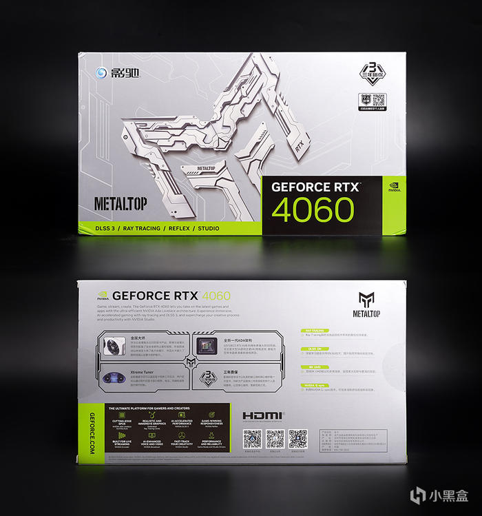 搭配显卡影驰 RTX 4060 金属大师 OC,包装上依旧延续了金属大师系列经典设计,正面亮银的配色搭配金属机甲质感的 LOGO,背面图文展示产品卖点、规格、特性等信息。