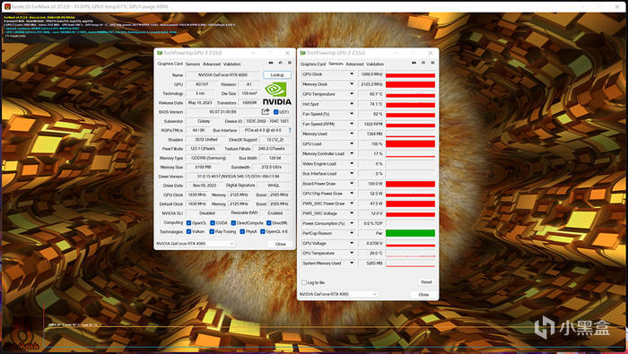 FURMARK 满载测试,GPU 频率 1900MHz 上下,显存维持 2000MHz ,过程 20 分钟左右,核心温度 60.9 度(结温 74.1 度),显示功耗 100W 左右。