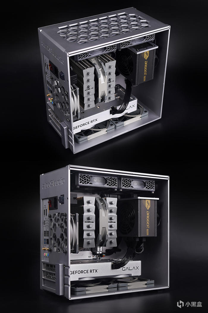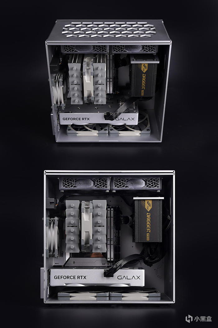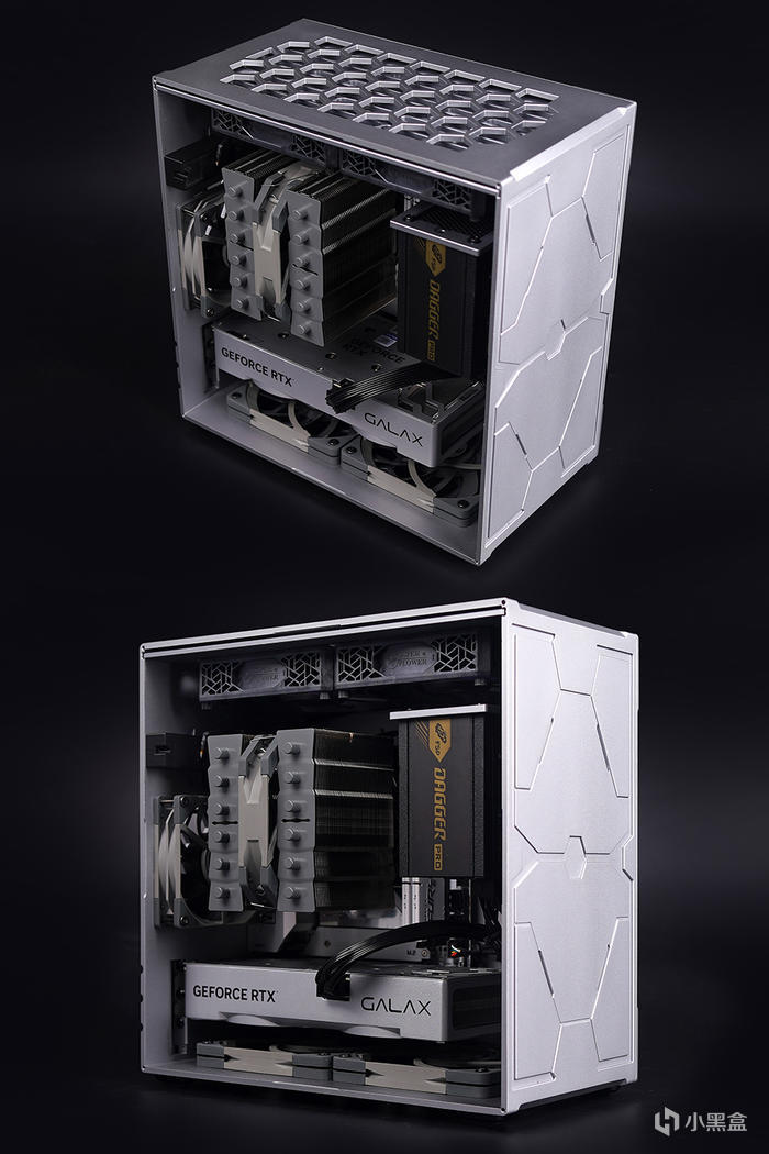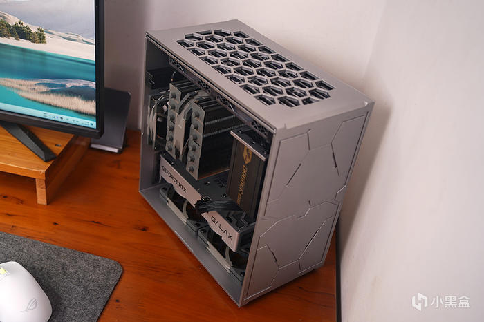 机箱顶部同样采用了大面积的六边形散热开孔设计,带有一个可以单独抽出来的冷排支架,可支持 240 冷排 AIO 或双 120 风扇安装。其它方面,可支持 135mm 以内的风冷、285mm 长度以内的显卡等。