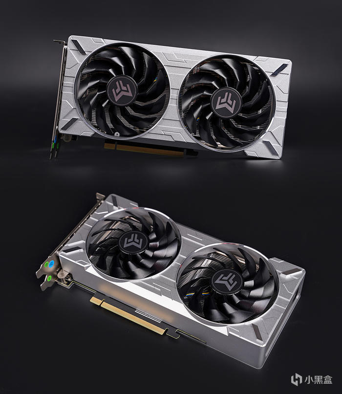 显卡外观采用全金属外壳打造,一体压铸铝合金的上盖,以宇宙魔方为灵感,采用不规则的线条呈现,极具美感和科幻感。显卡尺寸稍显 MINI 一些,采用双风扇设计,尺寸上只有240*128*42mm(含挡板)、228*123*41mm(不含挡板),更易于搭配小机箱。