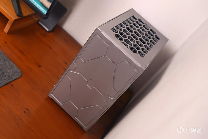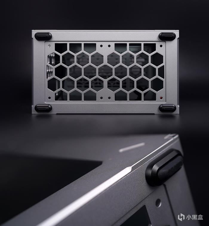 机箱底部采用大面积的六边形散热开孔设计,可支持安装双 120 风扇进风。脚垫采用 CNC 铝合金模块设计,需玩家自行安装,并贴上橡胶防滑垫。
