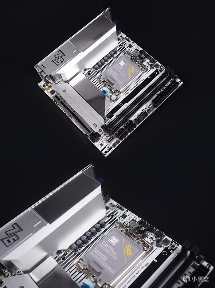 散热装甲条纹磨砂毛玻璃效果,非常漂亮,下方还有醒目的 76 Logo 字样。采用大面积寒霜合金散热护甲,全覆盖式冷凝帖配合高导热硅胶片,大幅提升主板对供电、存储、芯片组等高发热区域的散热效果,另外寒霜装甲还内置低噪音风扇进行辅助散,增强供电部分的散热效果散热效果。