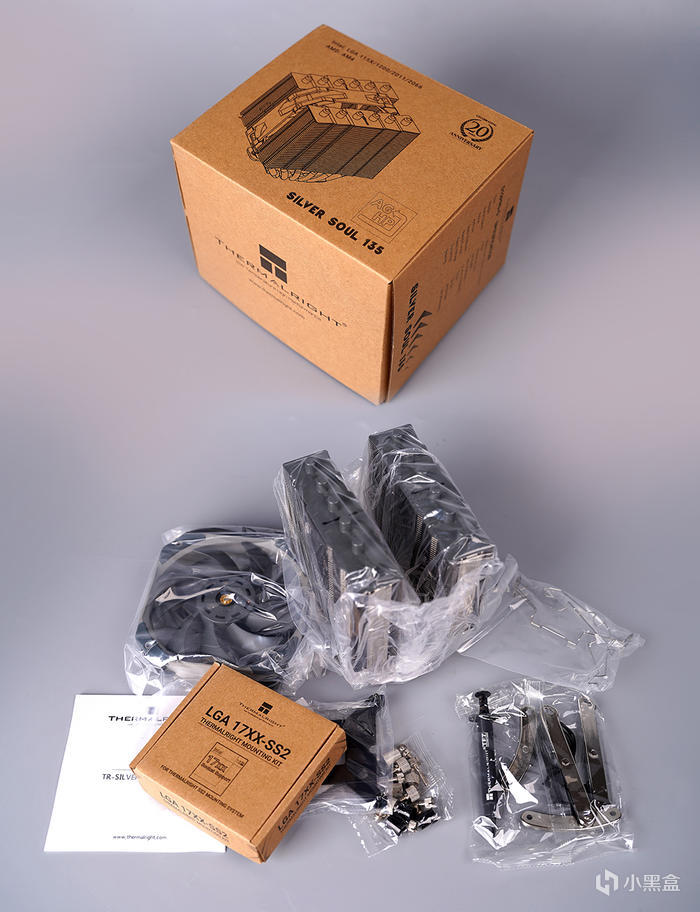 散热器选用的是利民的 SS135 银魂,型号对应其高度 135mm,适配机箱高度,采用工业牛皮纸包装,标配单风扇,但附件给到有两副风扇挂钩,支持玩家安装双风扇,配有 TF7 散热硅脂,扣具支持 AM4 及 INTEL 全家 。