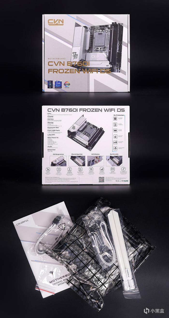 主板选用的是七彩虹 CVN B760I FROZEN WIFI D5,白色的包装盒,正面带有主板外观展示,烫金型号的标注,下沿 Intel RGB 图标,背面详细展示主板规格和各项卖点,以图文结合的方式为用户提供全面的信息。附件包括:1× 用户指南说明书、1× M.2 固定螺丝、2× 白色 SATA6 数据线、2 根超长的 WiFi 天线。