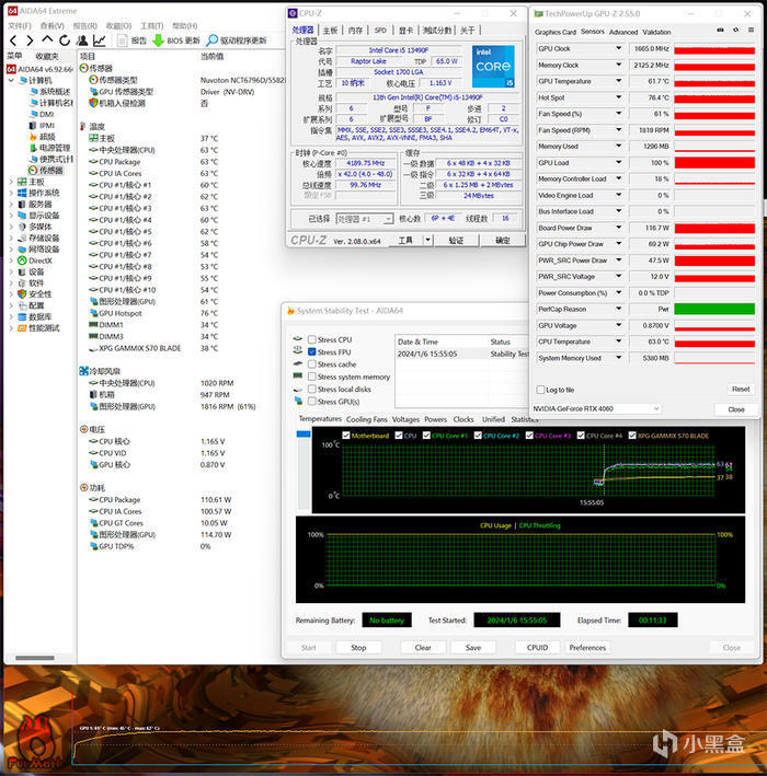 CPU P-CORE 温度最大值 63°C,E-CORE 温度最大值 54°C,CPU Package 功耗 110W 左右。