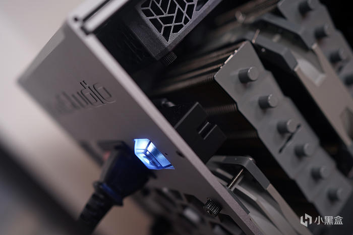 为了实现机箱一体的视觉效果, aboStudio Container M 并没有设置 I/O 接口,仅机箱尾部配置了一个开机按键。采用独特的机械轴开关设计,带白色的指示灯,很亮!很显眼!